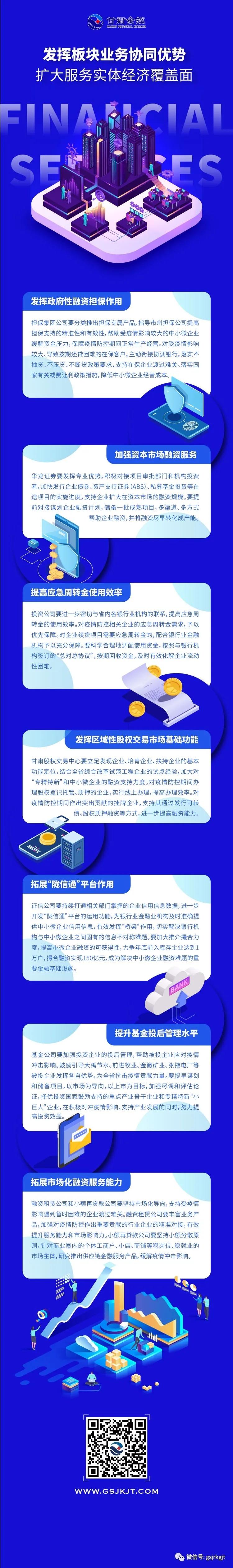 《通知》明确,各金融业务板块要进一步强化中小微企业金融服务,有效扩大服务实体经济覆盖面。要积极发挥政府性融资担保作用,加强资本市场融资服务,提高应急周转金使用效率,发挥区域性股权交易市场基础功能,拓展“陇信通”平台作用,提升基金投后管理水平,拓展市场化融资服务能力。