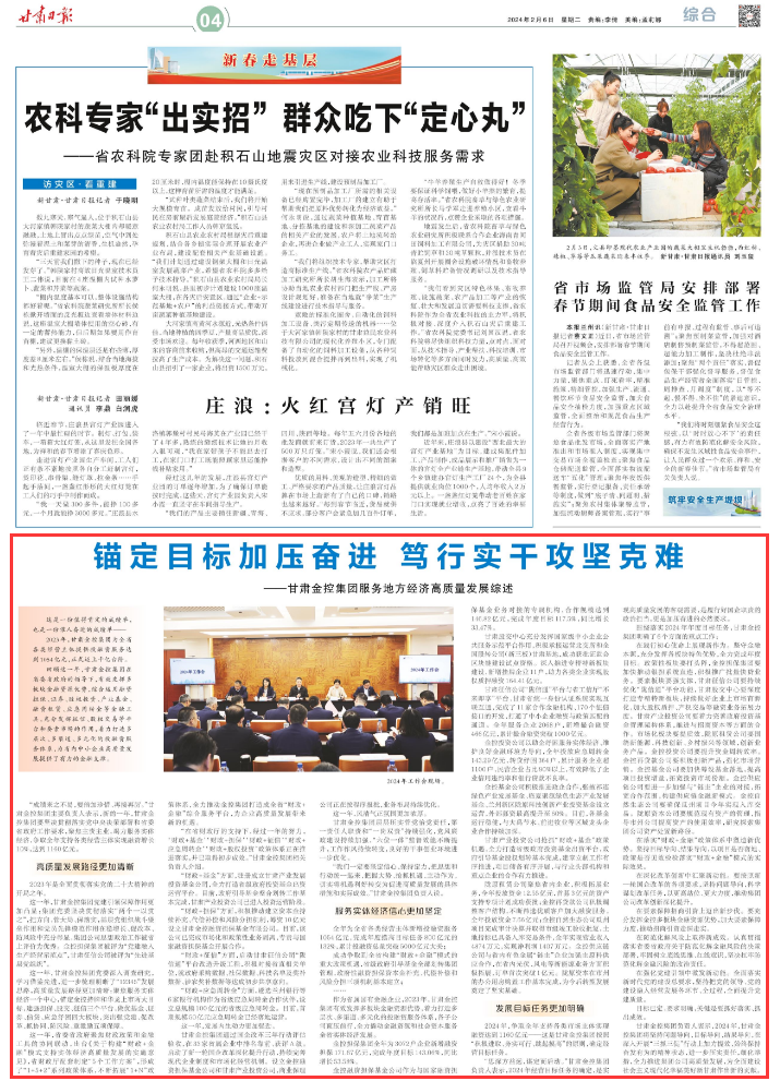 在践行初心使命上展现新作为。坚守金融本源,充分发挥各板块特色优势,全力完成年度目标。政策性板块要打头阵,金控担保集团要加快推动银担系统直连,积极推广批量快贷业务。要素板块要强支撑,甘肃征信公司要持续优化“陇信通”平台功能,甘肃股交中心要深度打造专精特新板块,持续做好企业上市培育孵化,加大股权质押、产权交易等融资业务拓展力度。甘肃产业投资公司要着力完善政府投资基金管理架构体系,推进与招商资本等方面的合作。市场化板块要提质效,陇原租赁公司要围绕新能源、科技创新、乡村振兴等领域,创新业务产品。金控投资公司要提升资金周转效率。金控再贷款公司要积极创新产品,强化市场营销。金控基金公司要加快筹设基金落地,提高项目投资增量,拓宽投资市场份额。金控供应链公司要进一步加强与“链主”企业的对接,拓宽合作范围,构建供应链金融新模式。金控自然生态公司要确保瓜州项目今年实现入库交易。陇原资本公司要规范现有资产的管理,指导市州公司提高资产的使用效率,研究探索集团公司资产处置新路径。